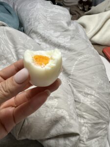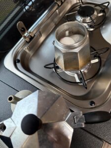 Am nächsten Morgen: Sonne, gute Laune – und Improvisation. Frische Brötchen gab’s zum Glück vor Ort. Eier auch. Nur… kein Topf. Also haben wir die Eier kurzerhand in der Kaffeemaschine „zubereitet“. Ich würde sagen: kreativ gelöst. Funktioniert? Perfekt! 😄